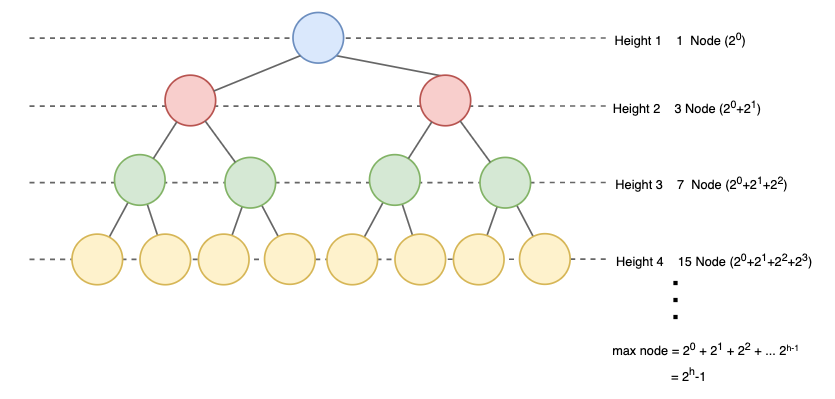 - 높이가 h이고 하나의 노드를 가진 트리의 높이가 1이라면 최대 노드 수는 \(2^h -1\) 이고 높이가 0이라면 \(2^{h+1}-1\) 입니다.