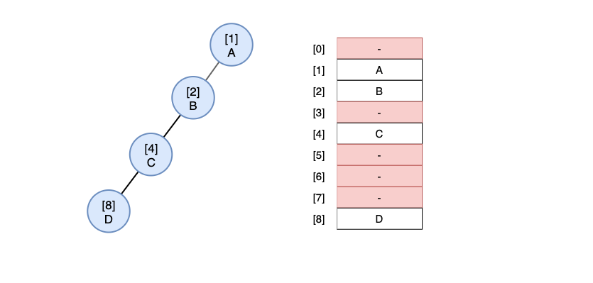 편향 이진트리 같은 경우 많은 공간이 낭비될 수 있고 배열 크기 이상 노드를 추가할 수 없습니다.