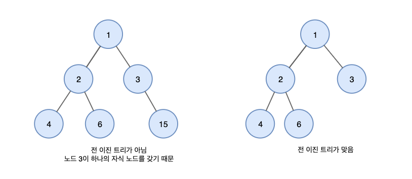 - 전 이진트리에서 리프 노드 수는 항상 자식이 두 개인 노드보다 하나 더 많습니다.