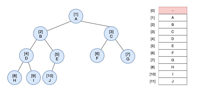 이진트리는 다음과 같은 속성 때문에 배열로 표현이 가능합니다.