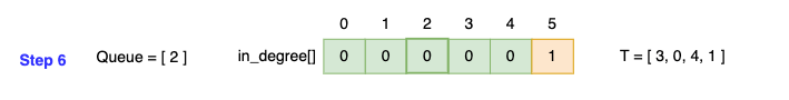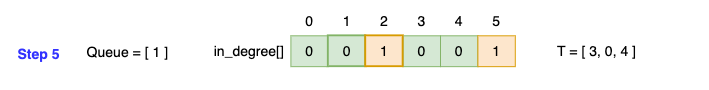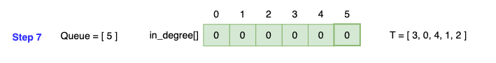 - in_degree값이 0인 정점 5를 queue에 enqueue()하고 방문표시합니다.