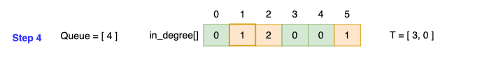 - 정점 3에 인접한 정점중 방문하지 않은 정점 (0, 4)의 in_degree를 하나 감소합니다.
